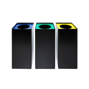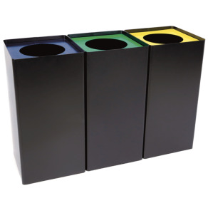 Setul de cos de colectare selectiva a gunoiului este realizat din otel vopsit in camp electrostatic si ofera sortarea deseurilor in functie de provenienta acestora, fiecare recipient fiind individualizat prin culoare.