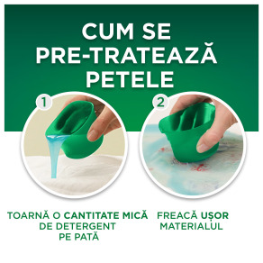 Ofera o curatare exceptionala cu o singura spalare, chiar si la temperaturi mai scazute si ciclu mai scurt. Formula sa a fost special conceputa pentru ciclu la temperatura scazuta si scurt, cu actiune Turbo Clean. Spala la temperaturi mai scazute cu detergentul lichid Ariel: economiseste energie la fiecare spalare si redu emisiile de CO? ale rufelor tale. Detergentul lichid Ariel ofera stralucire hainelor albe si impiedica aparitia petelor de transpiratie. in plus, detergentul lichid Ariel contine enzime de origine naturala si este disponibil intr-un ambalaj reciclabil. Pentru pete foarte dificile, foloseste detergentul lichid Ariel pentru a pretrata cu ajutorul capacului, apoi pune hainele in masina de spalat. Pentru rezultate optime, introduceti capacul de dozare ce contine detergentul de rufe in cuva masinii de spalat