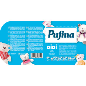 Hartia igienica PUFINA DIDI este realizata din 100% celuloza, de calitate superioara fiind o hartie puternica si fina cu trei straturi extra matasoase, culoare alba, fara parfum, fara colorant, testata dermatologic ceea ce confera siguranta pentru pielea sensibila si delicata.