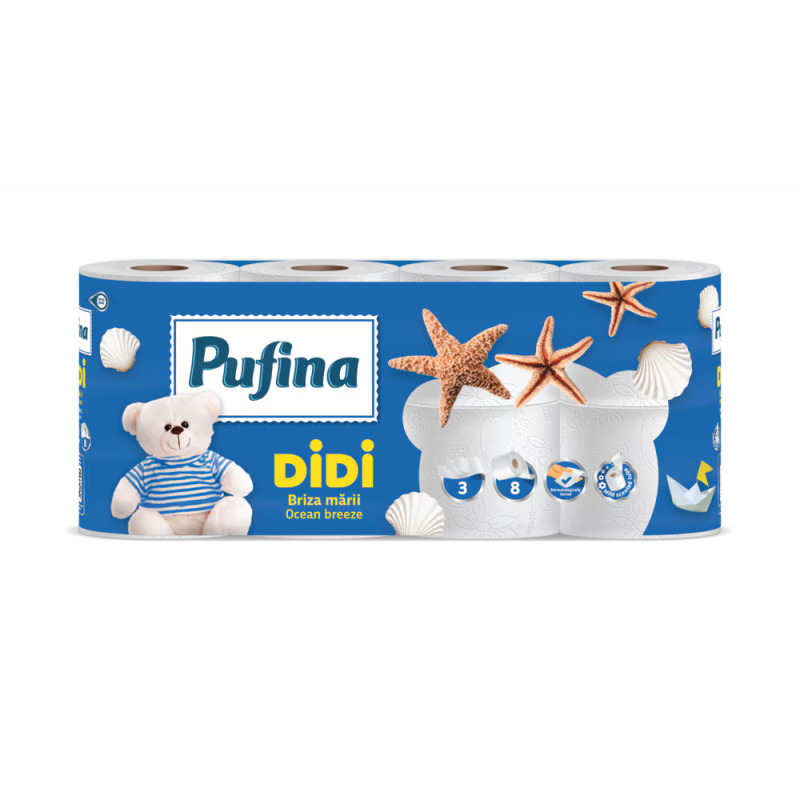 Hartie igienica Pufina Didi, 3 straturi,miros briza marii, 8 role/set