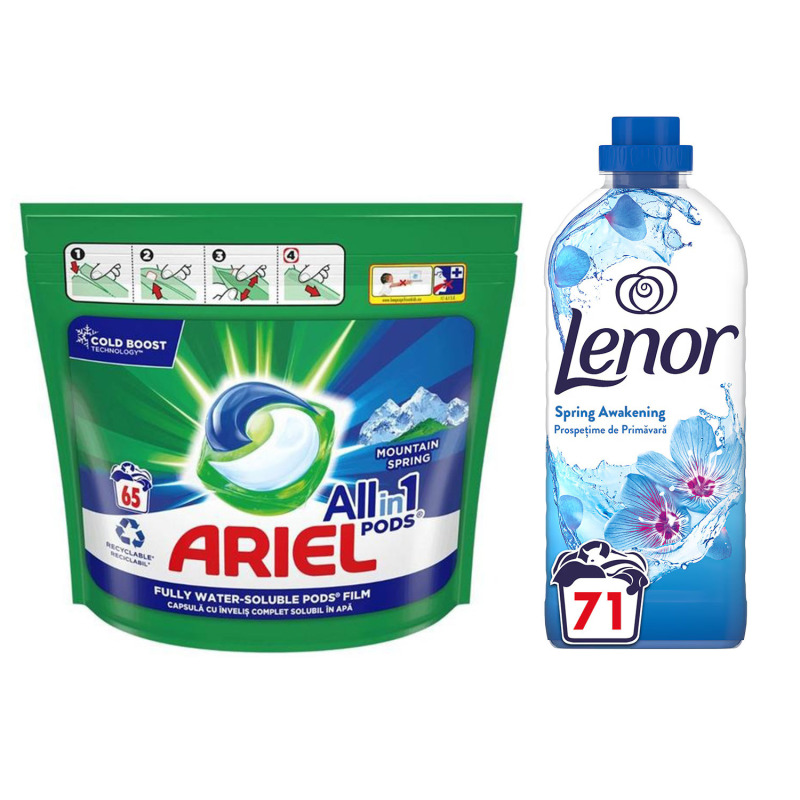 Pachet Detergent Capsule Ariel 3 in 1, 65 buc + balsam Lenor Spring Awakening include :